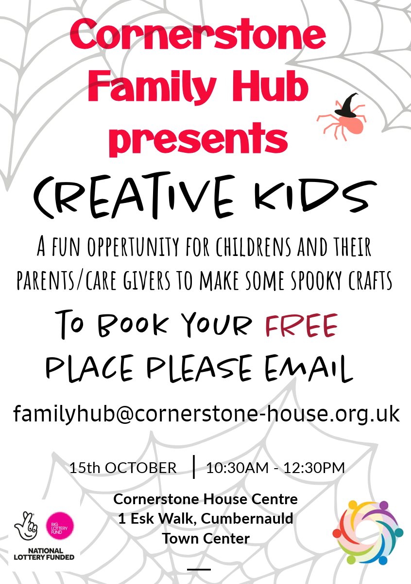 If your family would like to benefit from Cumbernauld Family Hub activities, events and support during 2024-25, please contact Cornerstone House Centre’s Family Hub Project Coordinator Nikki Main on 01236 739220 or email familyhub@cornerstone-house.org.uk for more information.